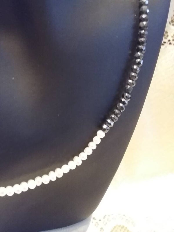 Freshwater Pearl and Black Spinel irregular spaced necklace.These are small baroque pearls and 2mm black spinel. The length is 20in and the necklace is finished with a Sterling Silver Lobster Claw Oval Clasp. The clasp is attached to Sterling Silver thread protectors.